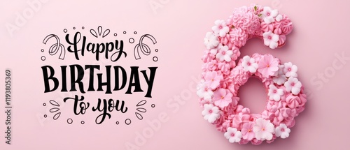 © Fernando, Naklejka premium Happy 6th Birthday Floral Cake Number Six Pink Background