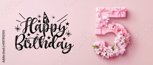 Naklejka premium Happy 5th Birthday Floral Number Five with Pink Gift Boxes and Flowers