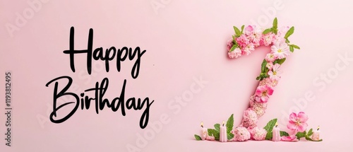 Naklejka premium Happy 7th Birthday Floral Number Seven with Candles Pink Background