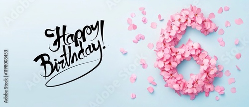 Naklejka premium Happy 6th Birthday Floral Number Six Pink Flowers Festive Celebration