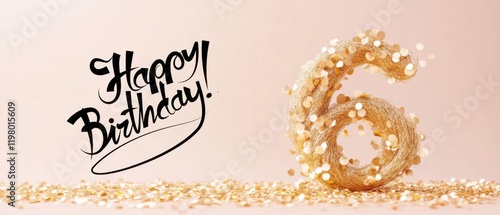 © Fernando, Naklejka premium Happy 6th Birthday Gold Glitter Number Six Celebration Image