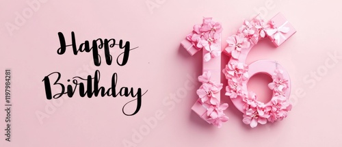 © Fernando, Naklejka premium Happy 16th Birthday Pink Floral Number Sixteen Celebration