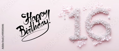 © Fernando, Naklejka premium Happy 16th Birthday Sparkling Pearl Number Sixteen on Pink Background