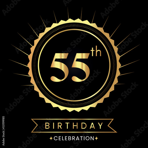 © VectoNations, Fototapeta premium Happy 55th birthday with gold badges isolated on black background. Premium design for poster, banner, birthday card, greeting card, birthday celebrations, invitation card, congratulations.