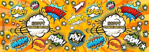 Naklejka premium Happy Thanksgiving horizontally illustration with comics , retro, vintage...