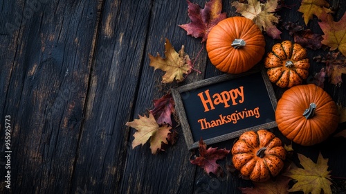 Fototapeta premium Happy Thanksgiving text with pumpkins and autumn leaves. Thanksgiving background