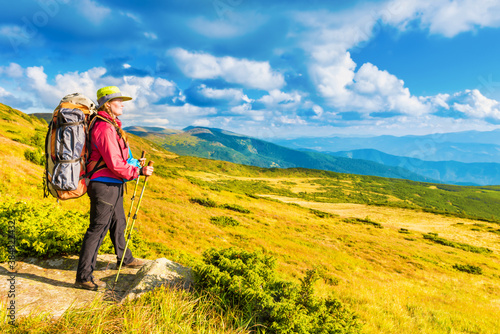 © Pavlo Vakhrushev, Naklejka premium Happy traveling woman with backpack looking at mountain landscape