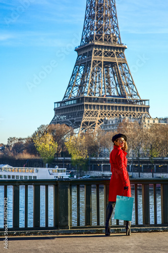 © Alliance, Fototapeta premium happy trendy woman standing on embankment in Paris, France