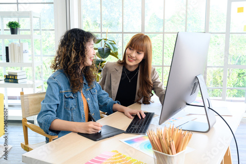 © bigy9950, Fototapeta premium Happy two young female graphic designers discussing with colleague in office. Creative people working together using computer at desk.