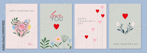© Sviatlana, Fototapeta premium Happy Valentines Day cards set. Modern abstract art design with hearts and modern typography. Templates for celebration, ads, branding, banner, cover, label, poster, sales