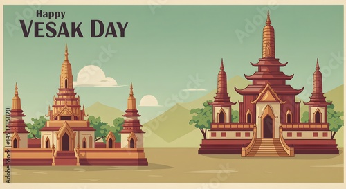 © M.Rivalsyah, Naklejka premium Happy Vesak Day: Vintage Illustration of Buddhist Temples