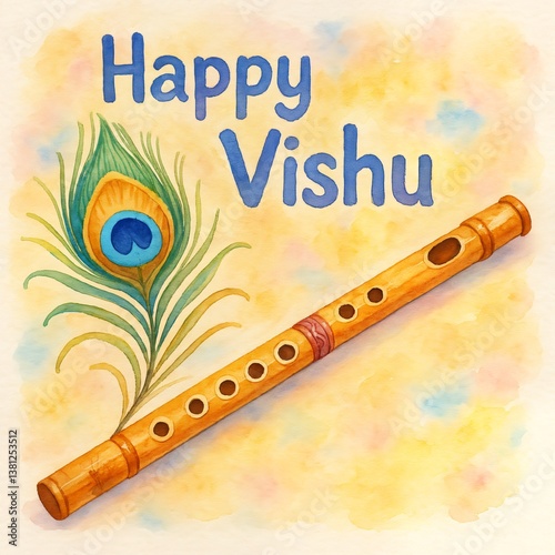© Milano, Fototapeta premium Happy vishu greeting card with peacock feather and flute