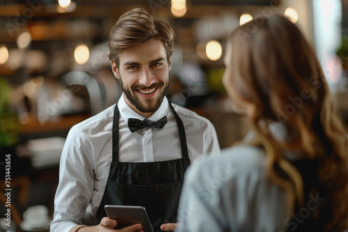 © PHAISITSAWAN, Fototapeta premium Happy waiter holding a tablet with a woman while taking her order in a cafe. AI Generated
