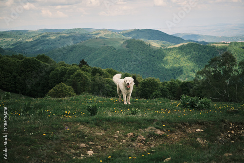© KatyaPulka, Naklejka premium Happy white dog standing in a lush green mountain meadow. Breathtaking landscape background. Perfect for travel, nature, and pet-related projects.