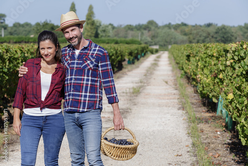 © auremar, Fototapeta premium happy wine grower family walking in vineyard