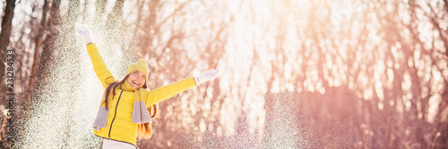 Naklejka premium Happy winter girl playing outside throwing snow outdoor in forest having fun - banner panorama lifestyle.