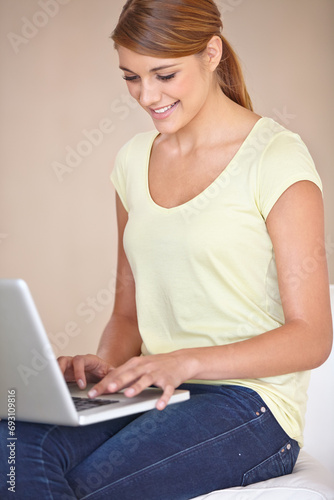 Naklejka premium Happy, woman and typing on laptop in home to update blog post, social media and digital subscription for remote work. Freelancer, smile and computer for online shopping, email or research on internet