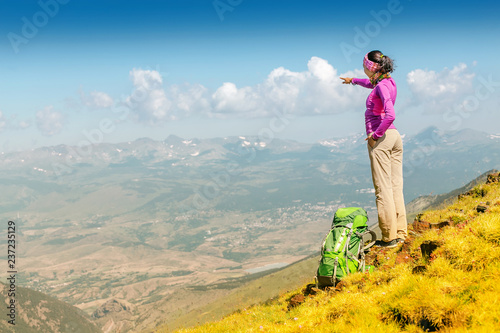© EdNurg, Naklejka premium happy woman backpacker and hiker looking at the view with arms outstretched on mountain top
