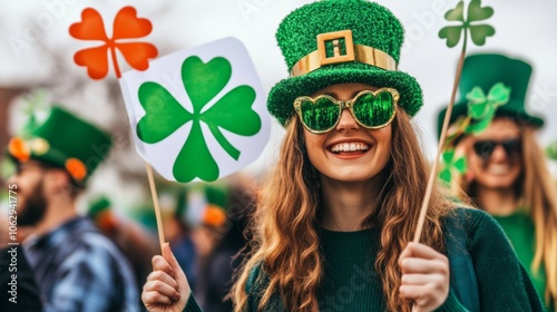 © A4719, Obraz premium Happy Woman Celebrating St Patrick s Day with Shamrock Flags