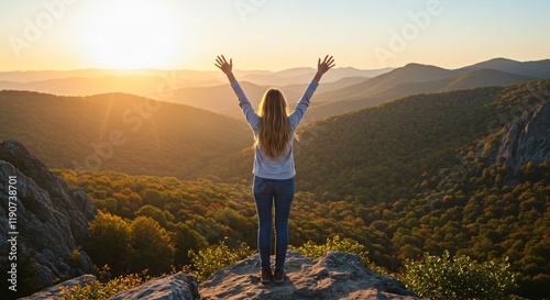 © _, Obraz premium Happy Woman Enjoying Sunset on a Mountain Peak
