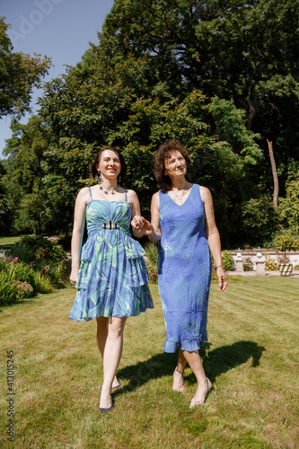 © ibilyk13, Fototapeta premium Happy woman have fun in evening gown. Mom and her daughter laughing and walking at the park. Two middle aged women chatting and looking at each other dressed in long dresses.
