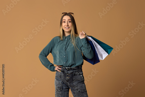 © Rychko Yevhen, Fototapeta premium happy woman holding shopping bags with purchases