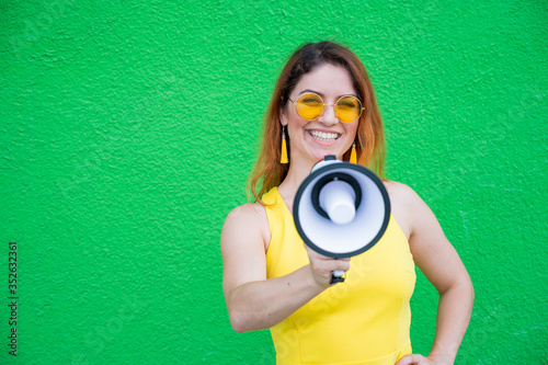 © Михаил Решетников, Fototapeta premium Happy woman in a yellow dress glasses and earrings on a green background shouting into a megaphone. Portrait of a girl holding a loudspeaker. Lady with a perfect snow-white smile.