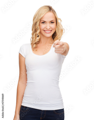 Fototapeta premium happy woman in blank white t-shirt pointing at you