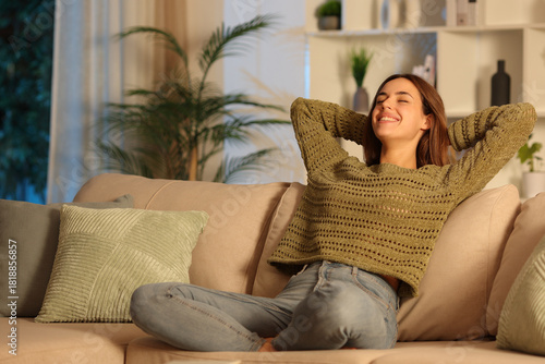 © PheelingsMedia, Obraz premium Happy woman in green relaxing at home in the night