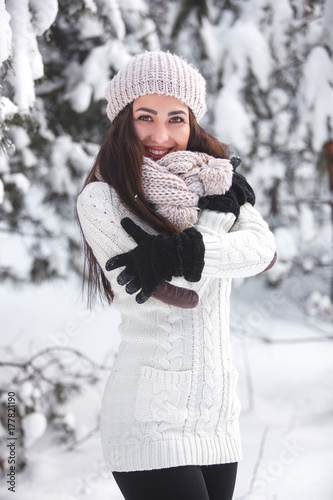 Obraz premium Happy woman on the winter background. Young pretty girl in the woods outdoors. Portrait of a cheerful beautiful woman.