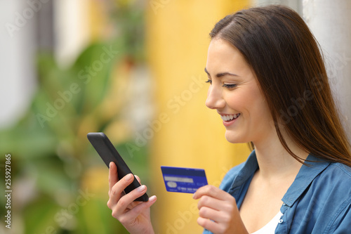 © Antonioguillem, Fototapeta premium Happy woman paying online using credit card and phone