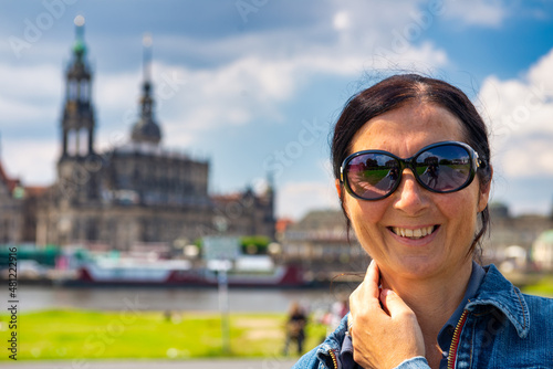 Obraz premium Happy woman relaxing during the city tour along the river on a beautiful sunny day.
