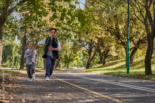 Fototapeta premium Happy woman riding on an e-scooter with her son. Young and beautiful caucasian woman rides electric scooter with boy in park.
