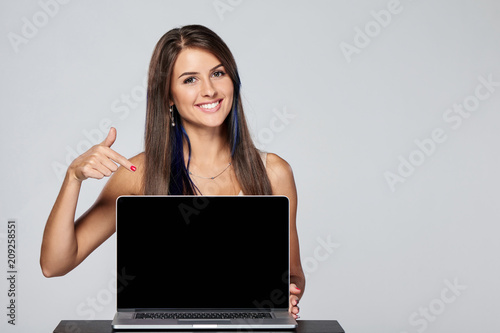 © paffy, Naklejka premium Happy woman showing blank black laptop computer screen, looking at camera pointing finger at monitor