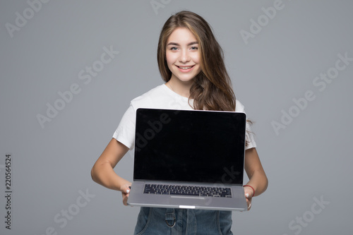 Naklejka premium Happy woman showing blank laptop screen over gray background.