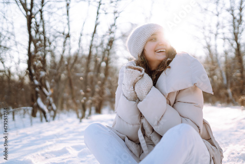 Obraz premium Happy woman walking on a snowy winter day outdoors. Beautiful woman having...