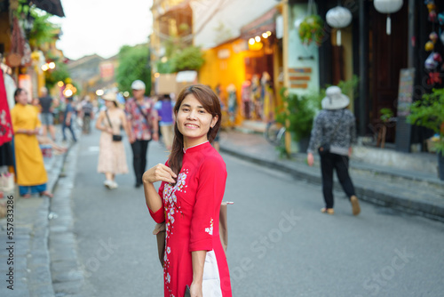 © Jo Panuwat D, Fototapeta premium happy woman wearing Ao Dai Vietnamese dress, asian traveler sightseeing at Hoi An ancient town in central Vietnam. landmark and popular for tourist attractions. Vietnam and Southeast travel concept