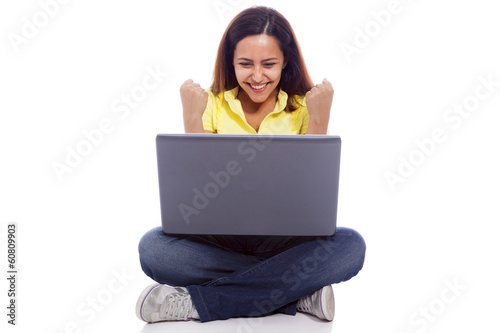 Naklejka premium Happy woman with a laptop and arms up, isolated over white backg