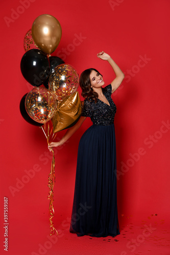 © New Africa, Fototapeta premium Happy woman with air balloons on red background. Christmas party