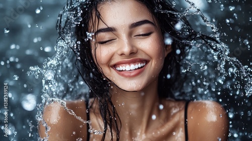 Obraz premium Happy woman with eyes closed bathes in refreshing water, radiant smile....
