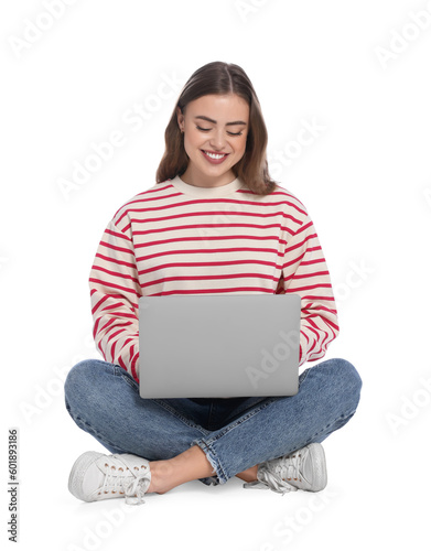 © New Africa, Naklejka premium Happy woman with laptop on white background