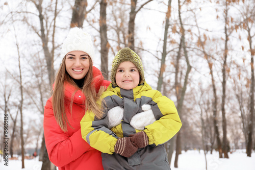 Fototapeta premium Happy woman with son in snowy park on winter vacation