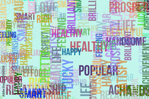 Fototapeta premium Happy word cloud, for design wallpaper, texture or background. Shape, pattern, clever, pretty, prosperity & care.