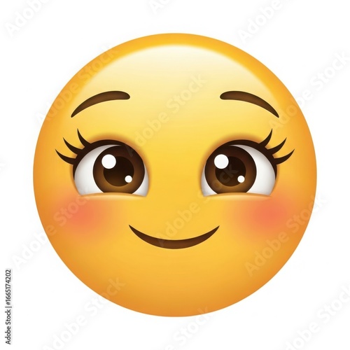 Fototapeta premium Happy yellow emoji with big brown eyes and blushing cheeks isolated on white background
