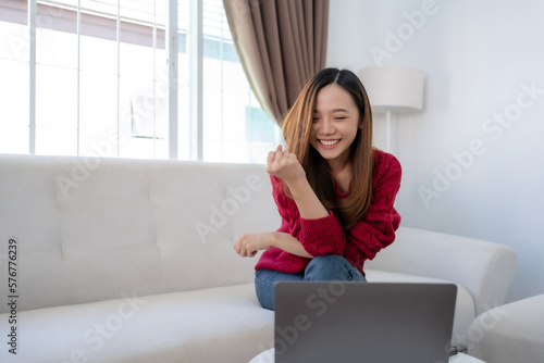 © amnaj, Naklejka premium Happy young Asian business woman successful excited raised hand rejoicing with laptop at home.