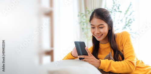 © Monster Ztudio, Fototapeta premium Happy young asian woman relax on comfortable couch at home texting messaging on smartphone, smiling girl use cellphone chatting, browse wireless internet on gadget, shopping online from home