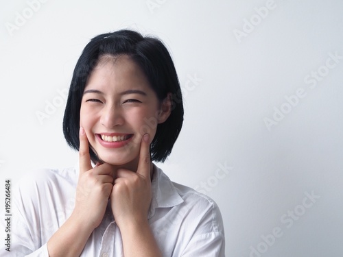 © Mallika, Fototapeta premium Happy Young Asian woman standing over white background.