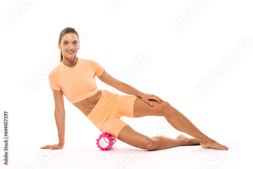 © Andrey_Arkusha, Obraz premium Happy young athletic woman doing gymnastics - isolated on white background
