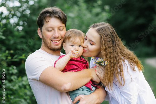Fototapeta premium Happy young beautiful family with a young son is enjoying a wonderful day in a summer park. Young parents kiss a child