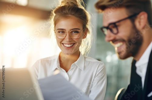 © Ekkarat_Studio, Obraz premium Happy young business team collaborating on a project in a modern office setting with laptop